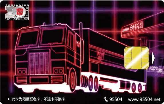 中國石油聯合中意人壽攜手孩之寶在2015年5月推出中國石油變形金剛系列加油卡第一張——擎天柱首發30周年紀念卡,全球限量發行。本卡具備中國石油普通加油卡的全部功能,在升級為記名卡后,該持卡人將有機會享受免費贈送的高額保險服務,參與當地中國石油加油站記名卡優惠活動以及更多的優惠活動。