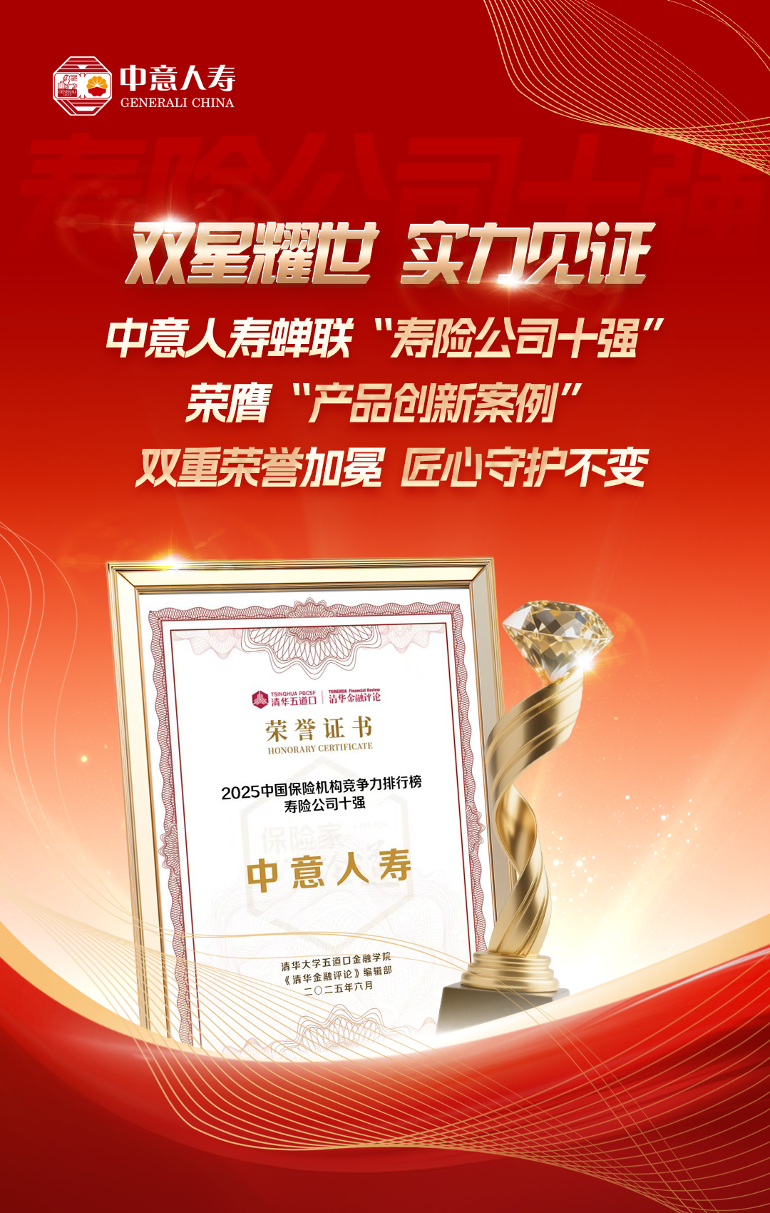 近日,《清華金融評論》正式發布《2025中國保險競爭力研究報告》,中意人壽保險有限公司(以下簡稱“中意人壽”)憑借其不斷攀升的綜合實力與創新能力,蟬聯《中國保險競爭力排行榜》“壽險公司十強”,并憑借“一生摯愛”系列產品,獲評“年度產品創新典型案例”。